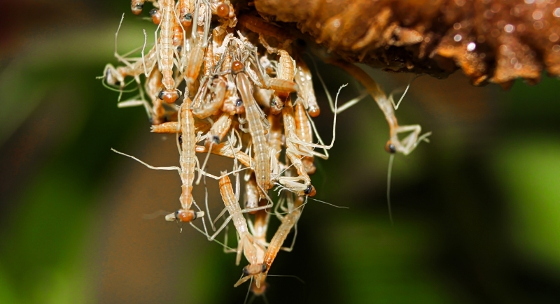 The environment they enter does not change to accommodate them. Food is not provided, and shelter is limited. Nymphs disperse quickly and begin hunting small insects such as flies, aphids, and other invertebrates. Cannibalism is common, particularly when individuals encounter one another in close quarters or when prey is scarce.