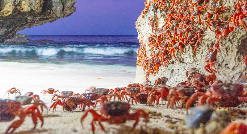 Tens of millions of red crabs march from forest to shore on Australia’s Christmas Island each wet season to breed. Their synchronized movement transforms the island’s landscape, sometimes forcing road closures. Hormonal changes triggered by rainfall set this mass migration in motion, peaking in October or November.