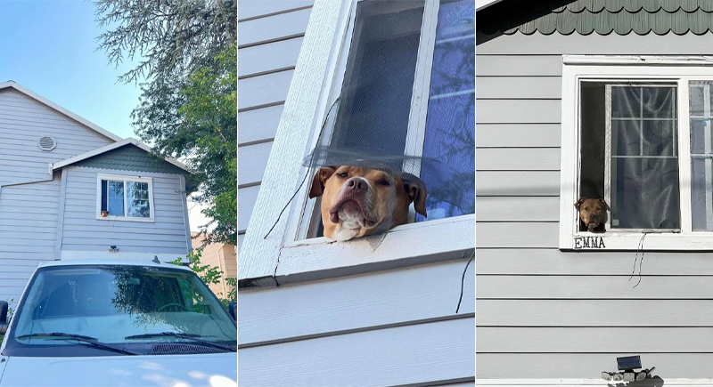 The owner put up a clear name tag beneath the window so anyone walking past could read it right away. The change was immediate. The next time Emma poked her head out, people called her by name instead of offering a generic greeting. Her tail wagged with extra energy, and the moment felt more like a friendly exchange between neighbors than a quick hello to a passing dog.