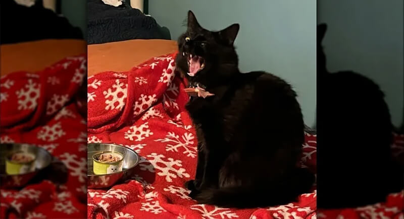 This black cat sat on a red blanket covered in snowflake patterns, staring at its food bowl. Just as it went in for a bite, it sneezed mid-meal with its mouth wide open, eyes squinting, and fur slightly puffed. The untouched food beside it says everything about how dinner ended.
