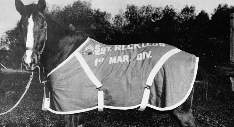 Sergeant Reckless, a Mongolian mare in the Korean War, carried ammunition and evacuated wounded Marines under heavy fire, once making 51 solo trips in a single day. She was wounded twice, promoted to Staff Sergeant, and awarded two Purple Hearts. She lived alongside the Marines she served, sharing their food, drink, and quarters.