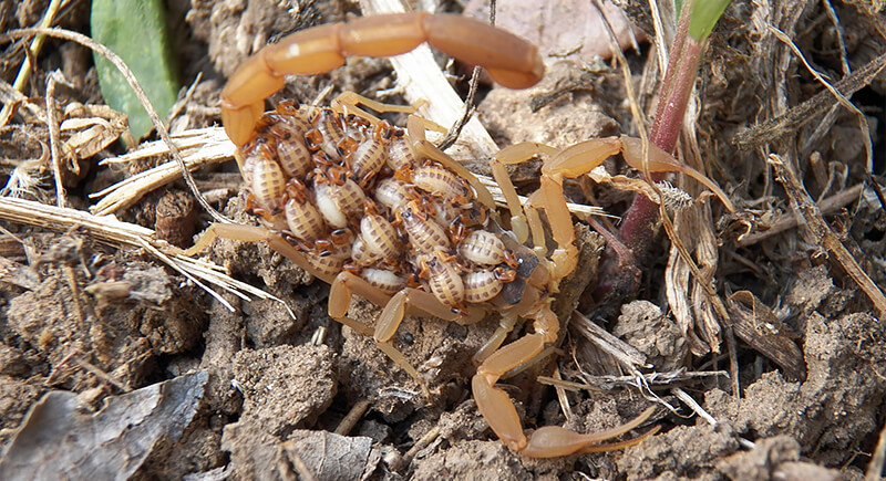 Scorpions give birth to live young instead of laying eggs. The newborns climb onto their mother’s back within minutes and cling there until their first molt. During that stage, she protects them and carries them everywhere. If food becomes scarce, cannibalism can occur, and the young may consume weaker siblings. After the first molt, they climb down and disperse on their own. That first shed skin marks the end of family life.