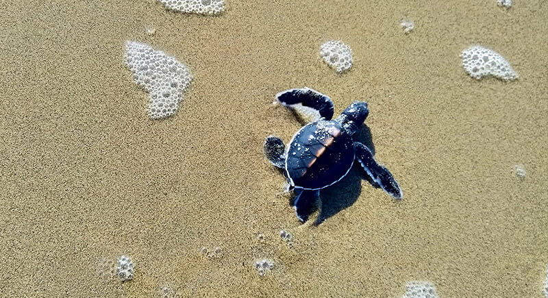 A female sea turtle comes ashore at night, digs a nest in the sand, lays dozens of eggs, and covers them before returning to the ocean. She does not stay. The eggs develop using the sun’s warmth, and the sand’s temperature helps determine whether the hatchlings are male or female. Weeks later, the hatchlings break out of the sand and move toward the brightest horizon, often the moon’s reflection on the water. Many are taken by predators on the beach and in the sea, and survival rates can drop below 1%. The mother does not return after laying the eggs.