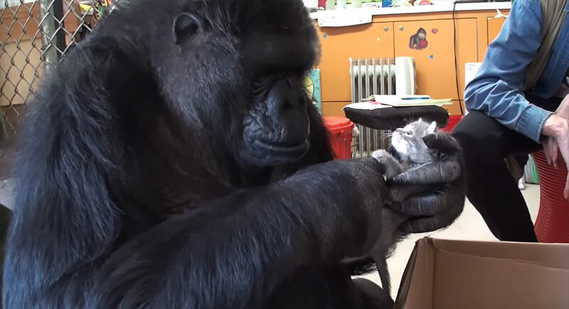 Koko, the famous gorilla fluent in American Sign Language, once cared for a kitten she named All Ball. Koko cradled and played with it gently, and treated it like a baby. When the kitten died in an accident, Koko signed “sad” and “cry,” then vocalized distress. Her reaction has been cited in studies about animal grief.