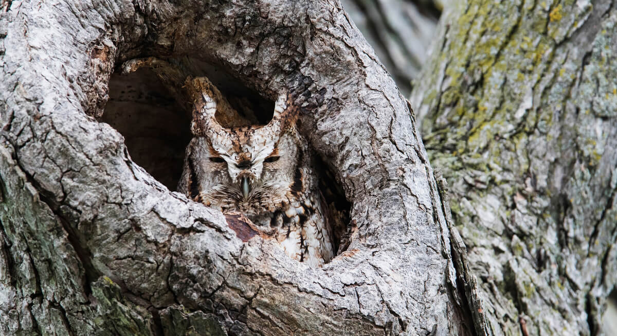 It is common for tree-dwelling birds to face constant exposure during daylight hours, and the eastern screech owl addresses this through feather patterns that mirror bark texture. Its gray and brown tones match the trunks where it rests. This adaptation reduces the attention it gets from both predators and smaller birds.