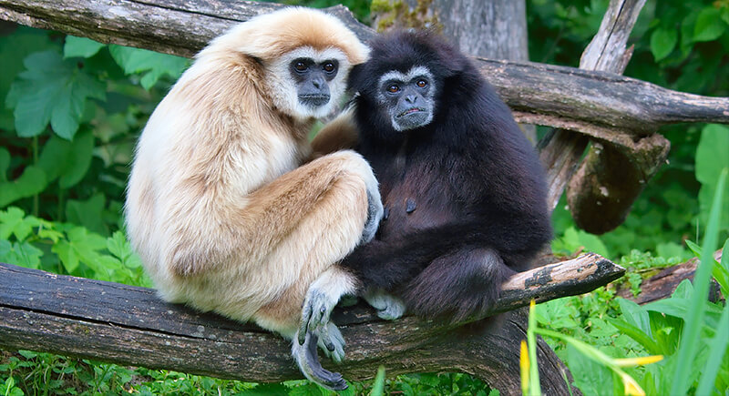 Gibbons are known for the coordinated calls they make at sunrise. Each pair develops a pattern that helps mark their territory. When they aren’t vocalizing, they stay close while moving through the canopy and grooming each other.
