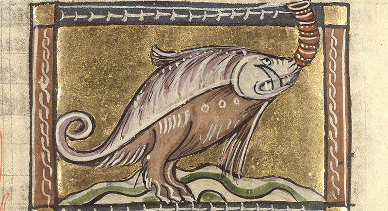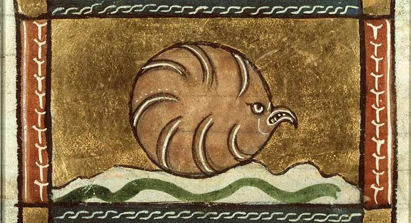 This creature comes from Der naturen bloeme (c. 1350), a Dutch illuminated manuscript adapted from Thomas of Cantimpré’s encyclopedia. It features what looks like a snarling pig’s head fused to a spiral snail’s shell. Medieval artists often copied from older drawings rather than life, so this may have been an attempt at a sea creature.