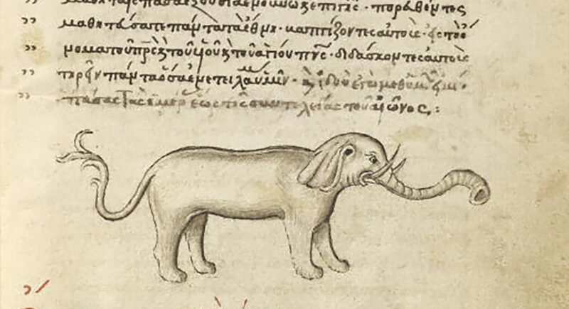 Illustrators often cobbled together bits from memory, rumor, or other drawings. This drawing, made in Greece around 1510, revealed how unclear elephants were to some artists. The limbs and posture resemble a backyard mutt, while the “trunk” stretches like a vacuum hose.