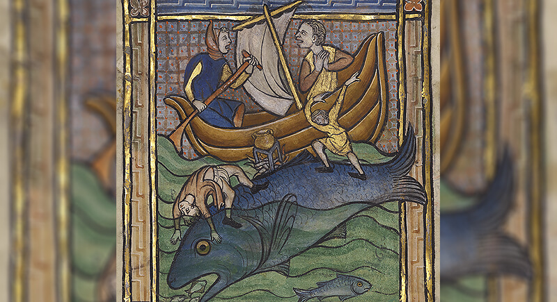 Medieval marine drawings often blurred lines between fact and fantasy, and this French manuscript from around 1270 shows it. Two fishermen are dealing with a massive sea creature. Its forward-facing eyes, blunt snout, and cartoon-like expression break from typical fish anatomy.