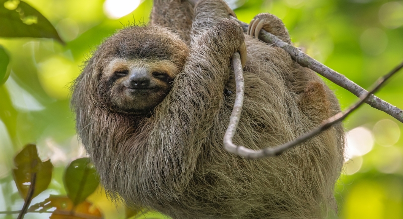 Almost every part of a sloth’s life is slowed to conserve energy. Digesting leaves can take weeks, and the leaves themselves provide little fuel. Sloths don’t move unless they must, which is rare. It goes to a point where their fur starts to grow algae in it, encouraged by the animal’s constant stillness and humidity.