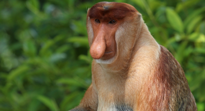 A long, pendulous nose hangs over the mouth of the male proboscis monkey. Researchers discovered that the enlarged nose amplifies vocal calls. Consequently, louder calls help males attract females and signal dominance to rivals. Females respond by moving closer to the vocalizing male, while rivals of the same gender assess the strength behind it.
