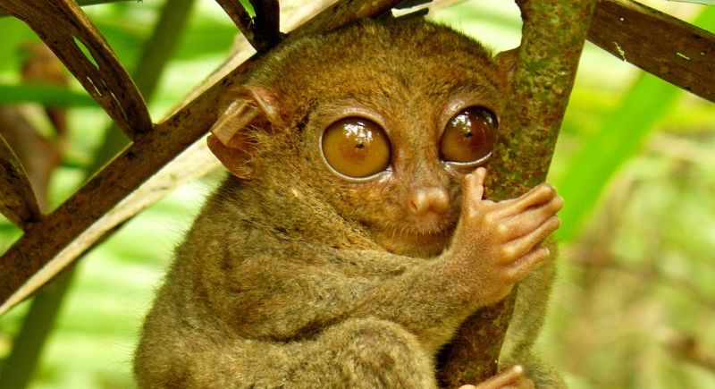 A tarsier’s face is mostly defined by its large eyes. Each eyeball is nearly the same size as its brain and cannot move within the socket. Instead of shifting its eyes, the tarsier turns its head to change its field of view. This ability helps it track insects and other small prey while hunting at night in Southeast Asian forests.