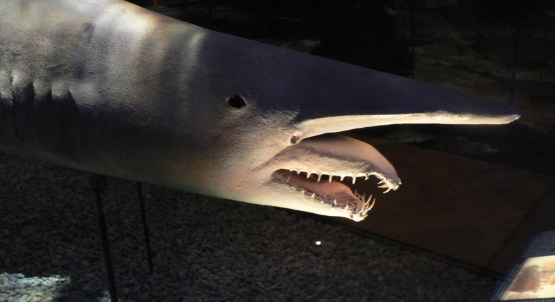An elongated snout extends forward and gives the goblin shark a striking outline. Inside that snout, there are electroreceptors that detect faint electrical signals emitted by prey. Beneath it, a protrusible jaw can thrust outward rapidly to capture food. The species lives thousands of feet below sea level, and the distinct profile enables feeding where vision alone cannot guide a predator.