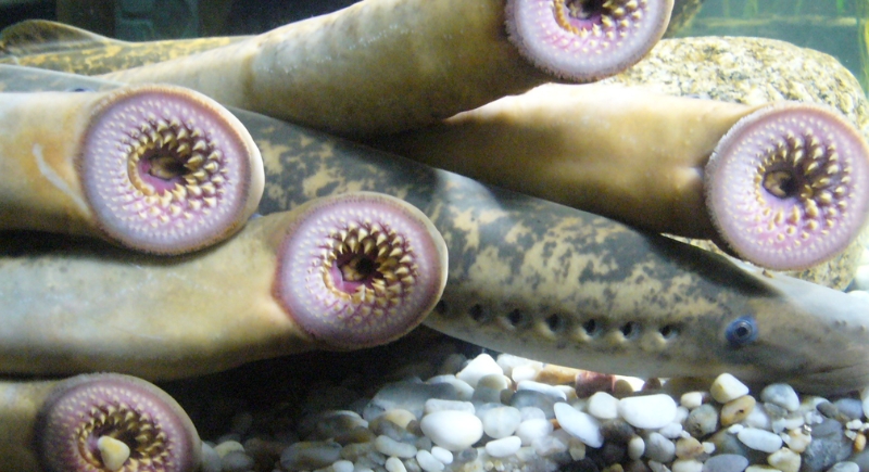It is not unusual for a lamprey to attach itself to a larger fish using its circular suction disc. That disc replaces a typical jaw and is lined with rows of sharp teeth that grip firmly against the host’s body. Parasitic species feed by drawing blood after locking into place.