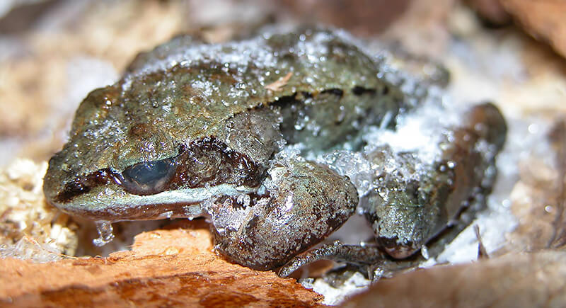 Wood frogs let themselves freeze solid. As temperatures drop, their bodies push glucose and glycogen into cells to act as antifreeze. The heart stops, as well as breathing, but ice doesn’t form inside the cells where it could do damage. When spring warms things up, the frog thaws, the heart starts again, and it goes back to hopping around like freezing itself was normal.