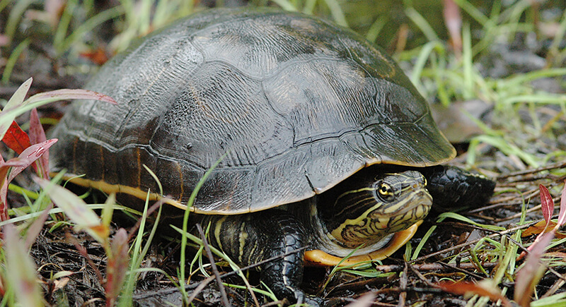 Early American settlers reportedly noticed that its meat tasted similar to chicken. The chicken turtle lives in freshwater habitats across the southeastern United States. It has an unusually long neck compared with other turtles. This feature helps it reach prey such as insects, small fish, and aquatic plants.