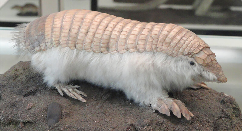 The pink fairy armadillo could pass for a cartoon character. It is actually the smallest armadillo species on Earth. Adults measure only a few inches long and weigh less than a quarter pound. Its pale pink shell contains blood vessels that help regulate body temperature in harsh desert conditions.