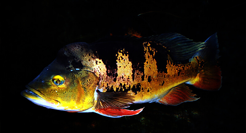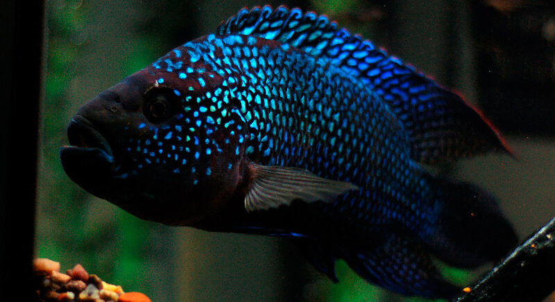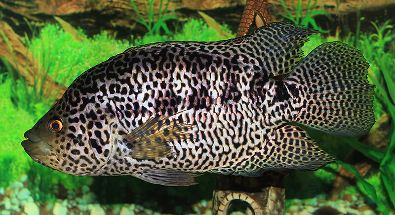 Named after the heavyweight boxer, this fish doesn’t shy away from a fight. Jack Dempseys like to dig and hide, especially when stressed, but they’ll lash out if another fish enters their space. Their colors shimmer under the right lighting, which makes them popular.