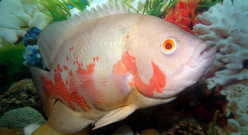 Red Devil Cichlids are known for their destructive redecorating and powerful jaws. They need at least 55 gallons for themselves. Many aquarists say they recognize people and follow movements outside the tank. Their bright red coloring helps them stand out, and they often view tankmates as either rivals or targets.