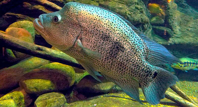 It starts off striped as a juvenile but eventually develops its signature spotted look. This fish thrives on protein-rich meals and requires ample swimming space. Owners often report they’re fast, calculating hunters that don’t hesitate to attack anything within reach, fish or objects.
