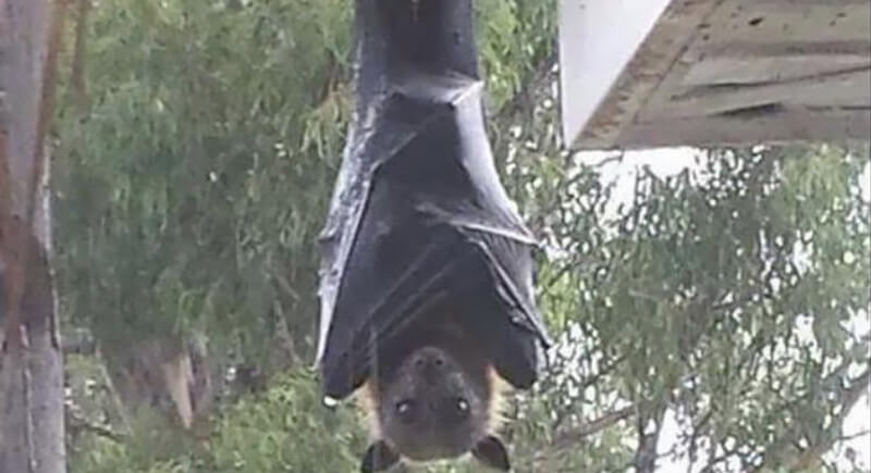 Hanging upside down from a roof gutter, staring directly into the camera, is an Australian flying fox. As the largest bats in the world, their wingspans can reach five feet. They roost in large colonies called camps, sometimes numbering in the hundreds of thousands. They typically avoid people when possible, so spotting one at eye level outside a home feels like something from a horror film.