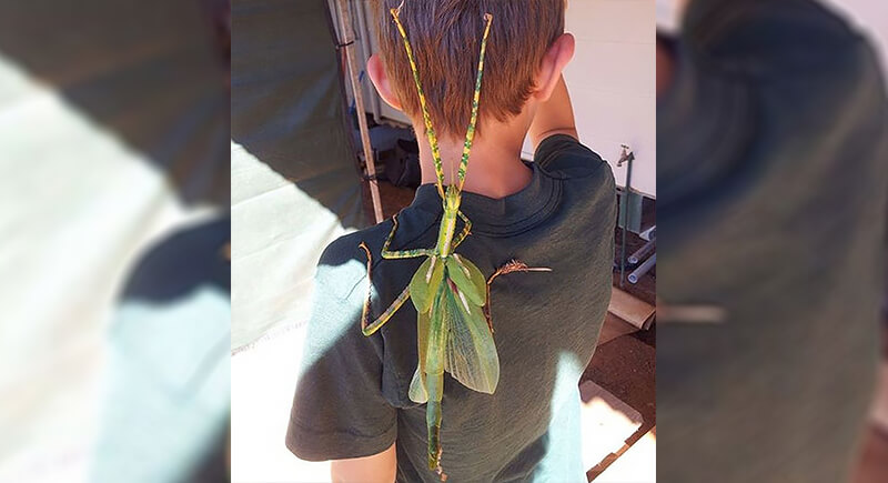 That leaf-like thing clinging to the back of this boy’s T-shirt is a giant praying mantis. Australia has several large mantis species, and adults can reach more than 4 inches in length. Their leaf-like wings and bright green bodies help them blend into the foliage of shrubs and trees. Although they are harmless to people, their spiked front legs grip tightly and can feel weird. Finding one hitchhiking on a child’s shoulder still feels uncomfortable.