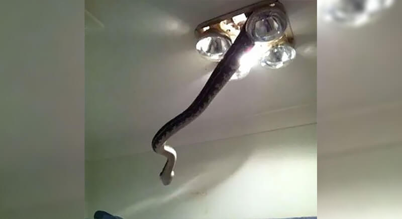 Anywhere else, that should be a loose cable dangling from the light fixture. But it’s Australia, and the residents are looking at a carpet python snake pushing through a ceiling. The species known to grow beyond 10 feet long sometimes enter homes because they follow heat and prey. While they are non-venomous, their sheer size makes them intimidating and raises many questions, like how long the snake was in there.