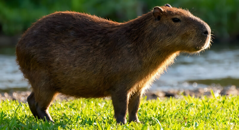 South America’s capybara looks like someone inflated a guinea pig to absurd proportions. These semi-aquatic creatures weigh around 140 pounds and grow up to four feet long. As highly social creatures, they live in groups of 10 to 20 individuals, though gatherings of 100 occur during dry seasons around shrinking water sources. They have webbed feet, which make them excellent swimmers.