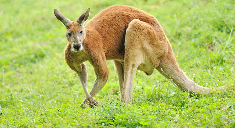 Standing nearly six feet tall and weighing up to 200 pounds, Australia’s red kangaroo dwarfs all other marsupials alive today. They cover ground at speeds exceeding 35 mph and clear 25 feet in a single bound. Red kangaroos can survive without drinking water for months. Females carry joeys in their pouches for about six months, and they can pause embryonic development during droughts until conditions improve.