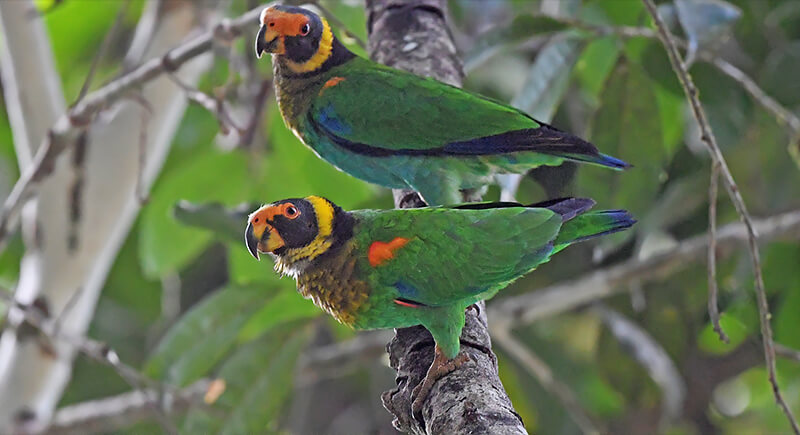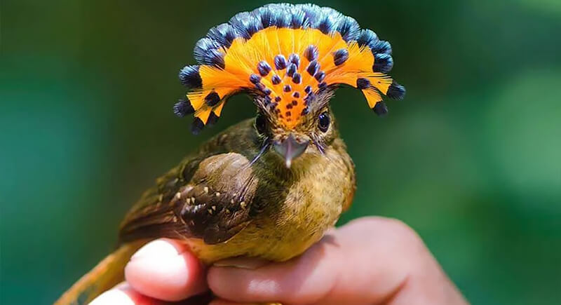 The name sounds like an exaggeration until you see what happens when it flares its crest. Normally hidden, that bright orange and blue fan bursts out in social displays. Its daily life is less flashy. It darts through humid forests and catches insects mid-air.