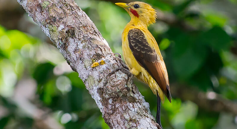 The cream-colored woodpecker has pale yellow plumage and a bold black mask that makes it easy to spot. Males add a bright red stripe along the cheeks, creating a sharp contrast against the face. Native to the Amazon, it drills into trees to reach ants and termites rather than to signal territory or attract attention through sound.