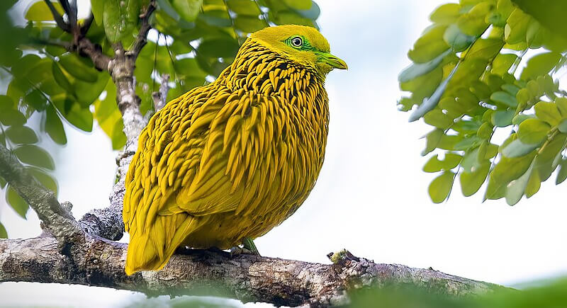 More highlighter than bird, the golden fruit dove is vivid yellow from beak to tail. Green markings near its eyes and feet only add to the surreal appearance. Native to Fiji’s forests, it’s easier to hear than spot, thanks to a surprisingly loud bark-like call echoing from the treetops.