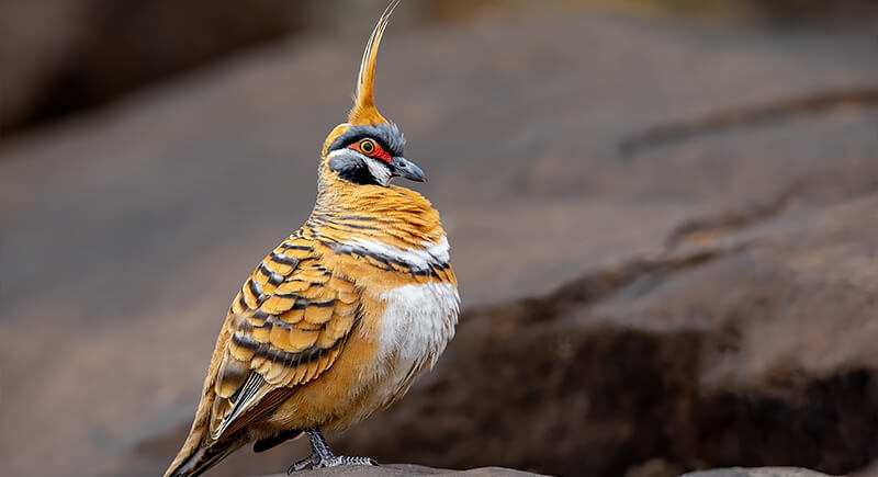 This ground-dwelling bird is found in arid regions of central and northern Australia. It has a distinctive spiky crest and reddish-brown plumage patterned with black and gray stripes. It survives in dry environments by staying near permanent water sources and primarily feeds on grass seeds.