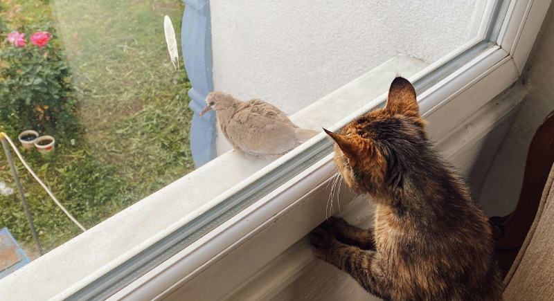 A chirp or chatter directed at birds or squirrels through a window is both exciting and frustrating. Cats mimic birdlike noises in anticipation of the hunt. Some researchers think it may be instinctive preparation for a bite or target motion—an example of muscle memory triggered by prey visuals.