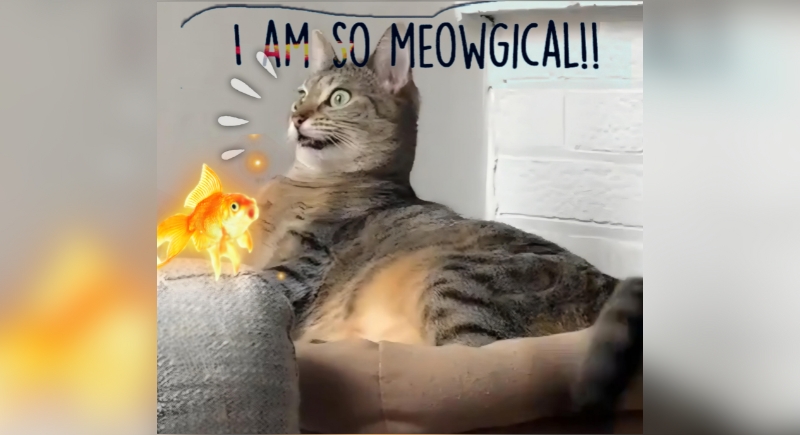 A cat sprawled on the couch suddenly freezes, eyes fixed on a glowing goldfish flickering just out of reach. There’s a sharp, almost cartoonish disbelief in that stare—no curiosity, no interest in food. For a moment, it’s as if the rules of the living room no longer apply, and reality itself is up for debate.