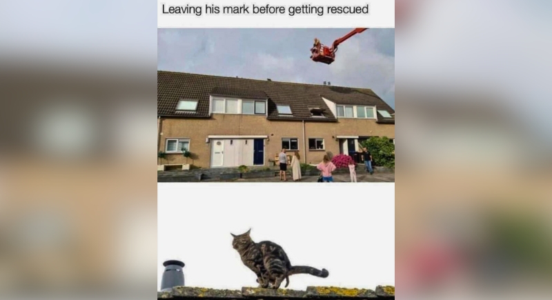 Crowd gathered, lift in motion, rescue in progress—and the cat is fully committed to handling its personal business before stepping into that cherry picker. Everyone came to witness a dramatic rooftop rescue, but they left with a front-row seat to something less noble and far more memorable. The hero moment got completely upstaged by the call of nature.