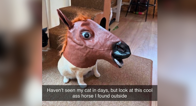 Nobody asked for a horse to show up in the living room, but here we are. The legs say “domestic cat,” yet the face screams “state fair sideshow.” That rubber mask fits too well, like the cat put effort into this identity swap. The best part isn’t even the disguise, but the way it just sits there, completely unfazed.