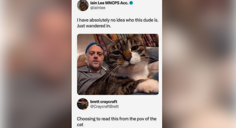 That face doesn’t say “pet.” It says “tenant who’s lived here for years.” The man beside him looks casual, but the caption flips everything: apparently, the cat has no idea who this guy is. Suddenly, it feels like the human wandered in and the cat’s documenting evidence for later.
