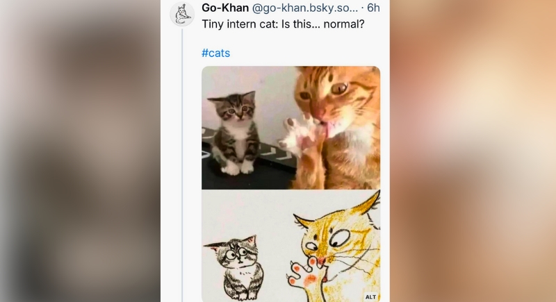 On one side, a seasoned cat is mid-groom and fully focused on the task at hand. On the other hand, a wide-eyed kitten is trying to process what it just walked into. That expression says it all: unsure, deeply confused, possibly reconsidering everything it thought it knew about adulthood. Someone even turned the scene into a sketch, which only makes the panic look more official.