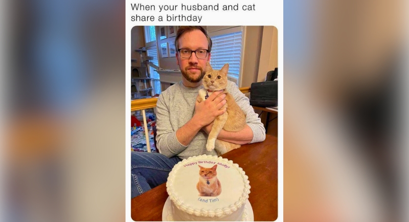 You can see “Happy Birthday, Moby (and Tim)” spelled out clearly on the cake. That cat got top billing, a solo photo on the frosting, and probably more gifts. Meanwhile, Tim got… included. The expression says he’s accepted it, because sharing a birthday with your pet sounds cute until you realize the guest list came for the cat and just politely greeted you.