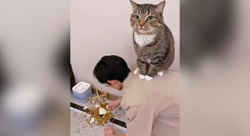No one requested this level of oversight, but here it is anyway. The cat knocked over the food stand, the human scrambled to fix it, and the cat climbed up for a better view—probably to critique the efficiency. There’s no apology, not even a hint of guilt. If cats ran offices, this is exactly how performance reviews would look: silent, watchful, vaguely menacing.