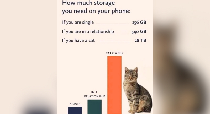 There’s a reason cloud storage keeps expanding: cat owners exist. You’ll scroll past baby photos, a couple of selfies, vacation shots, then hit the real payload—thousands of nearly identical cat pictures. The chart says 28 terabytes like it’s a joke, but anyone who’s ever tried deleting even one blurry yawn shot knows—it’s a conservative estimate at best.