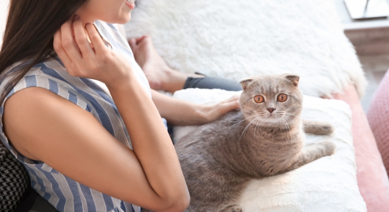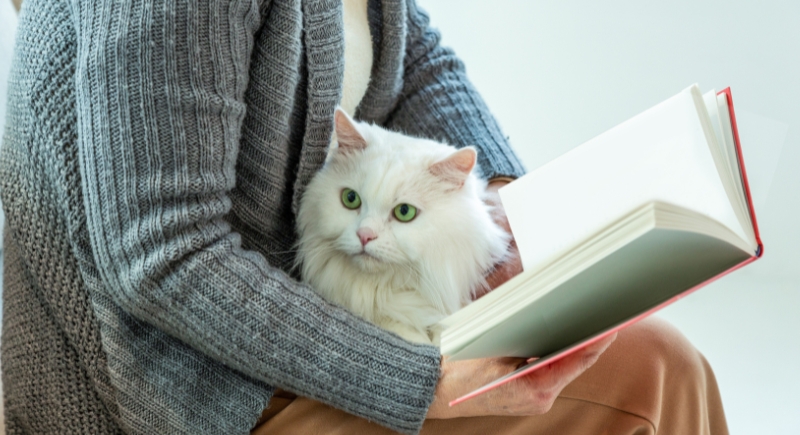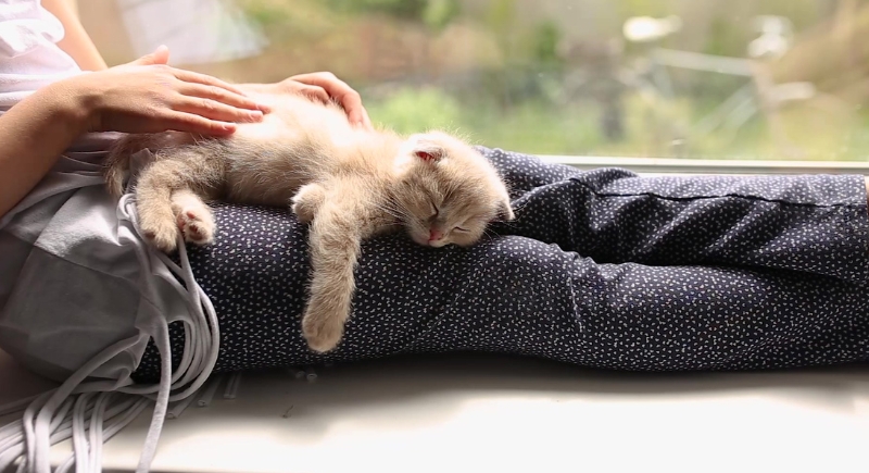 The steady rise and fall of your chest or lap can serve as ambient white noise. Cats often find rhythmic sounds and movement calming. Combined with warmth and familiarity, this sensory experience can be soothing enough to calm skittish cats.
