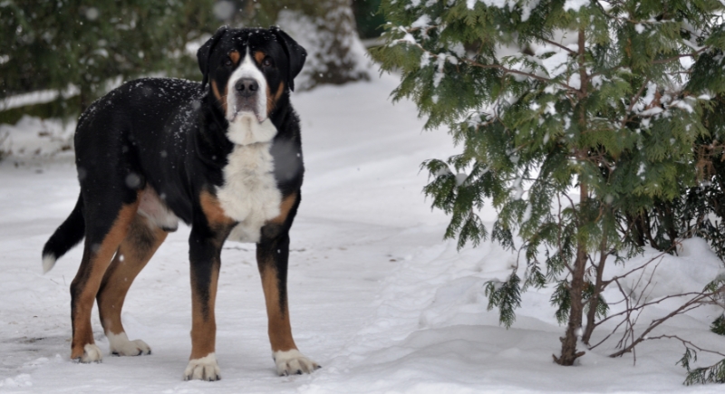 At first glance, the shorter coat seems misleading, but the dense underlayer provides solid insulation. This dog was bred to pull carts and guard farms in the Swiss Alps. Its muscular body generates heat through movement.