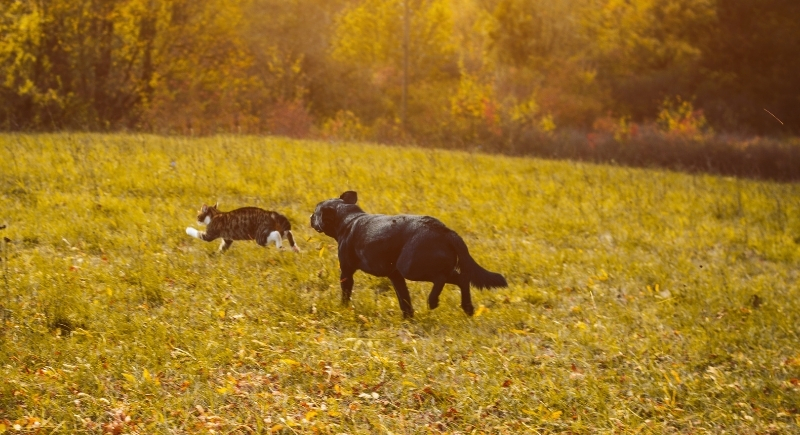 A bored dog may provoke other household animals because social interaction becomes a substitute for missing stimulation. Sudden chasing, rough play, or aggressive signals often occur when a dog seeks activity.