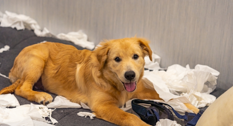 Though more common with excess, some dogs use displaced objects, including trash, as a way to “claim” an area. Dragging items out and spreading them around may feel like spreading their presence. It’s more common in multi-dog households or when new animals or people are introduced.
