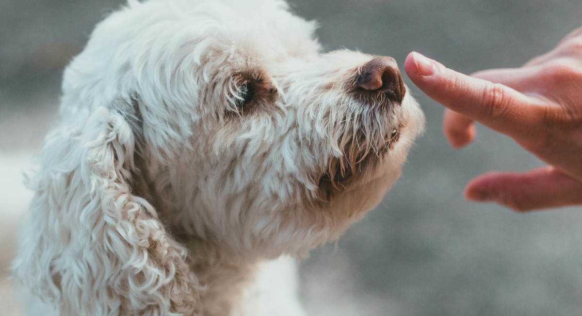Often taught as a hand target, “touch” gives dogs a clear way to engage with people and objects on cue. Vets use it to guide positioning without pulling or pushing. It also helps redirect attention during stressful moments and reinforces calm, positive contact.