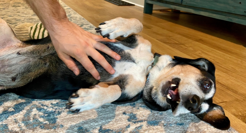 An upside-down sprawl is not always an invitation for a belly rub. Rolling over and exposing the abdomen often signals appeasement and vulnerability. In canine social language, the belly is a soft target, so showing it communicates deference. If the body looks tense or a growl slips out, the dog is requesting space.
