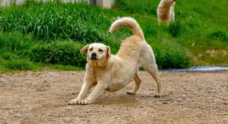 Some pups shrink themselves during greetings as if trying to disappear. Lowering the body makes them look smaller and less threatening. This posture can appear in fearful situations, but it also shows up during friendly play. Adult dogs sometimes crouch around puppies to appear less intimidating.