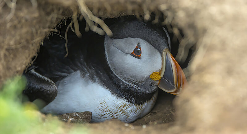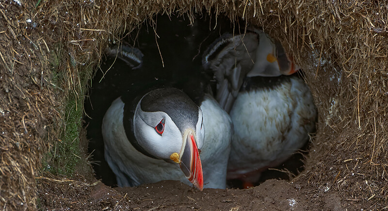 Growing up in complete darkness shapes the early life of a puffin chick. Deep inside the burrow, it stays protected from predators and wind. Both parents take turns delivering fish, which the chick depends on entirely. It remains underground for weeks before emerging for the first time.